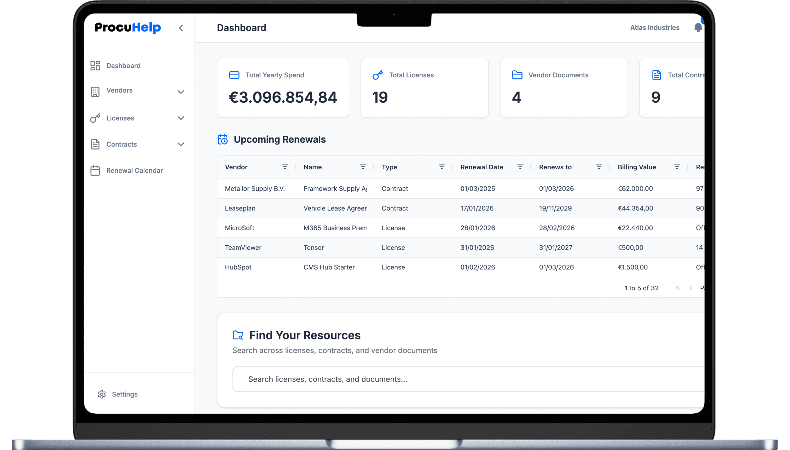 ProcuHelp helps you manage contracts, licenses, vendor documents and renewals in one clear overview.