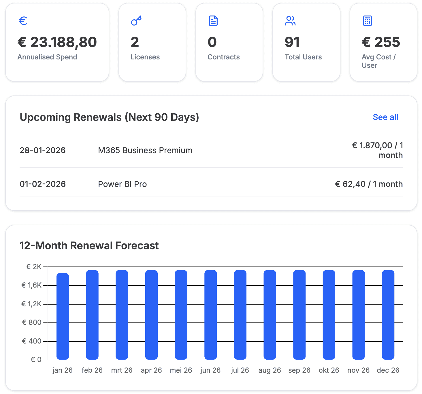No spreadsheets, no missed deadlines, no surprises — just insight into costs, obligations and upcoming renewals, exactly when you need it.